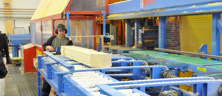 Finnlog uses a unique conveyor system for gluing lamellas, in which prepared lamellas are glued in five-metre sections. This mechanical conveyor system allows to produce large volumes from the technological perspective and is also simple and efficient, as the amount of manual work required is small. The glued laminated timber of the houses of Finnlog is precisely cut to size in the factory and therefore easy to use in construction.
